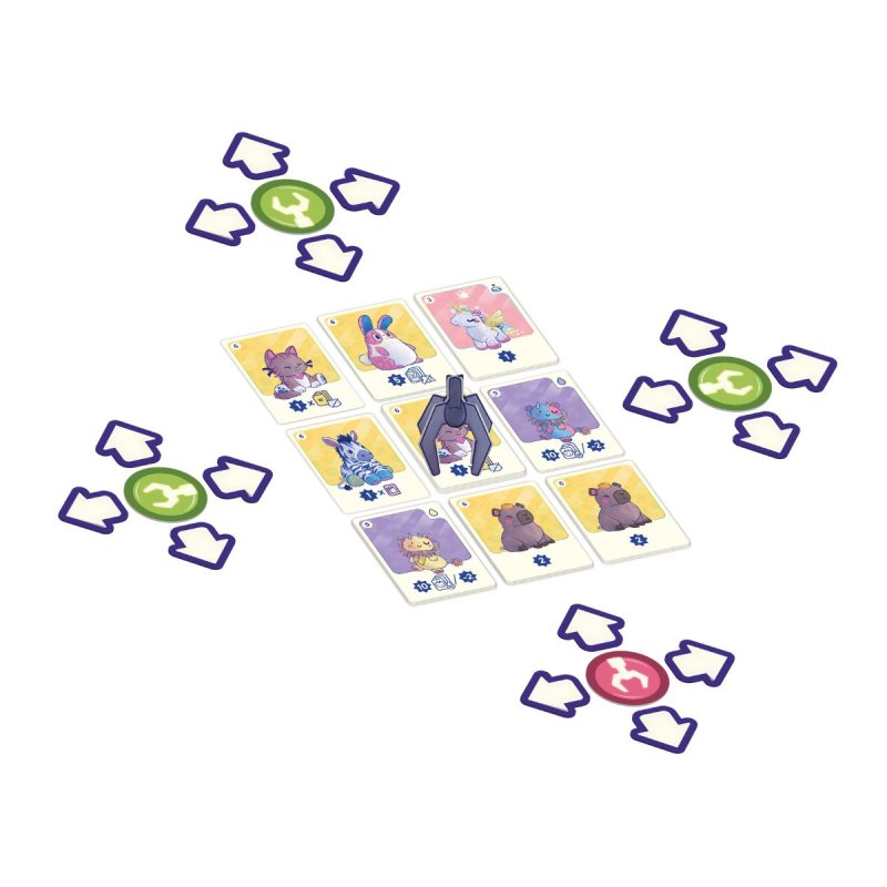 En Grúa de Peluches, los jugadores se convierten en concursantes con una misión: manipular una máquina tipo grúa para atrapar peluches y añadirlos a su colección antes que los demás. Con mecánicas fáciles de aprender, cada jugador debe gestionar sus flechas de recarga, mover la ficha de garra y tomar decisiones tácticas: ¿serás el que se lleva el peluche más raro y valioso, o el que provoca el desorden en la máquina de los otros?
